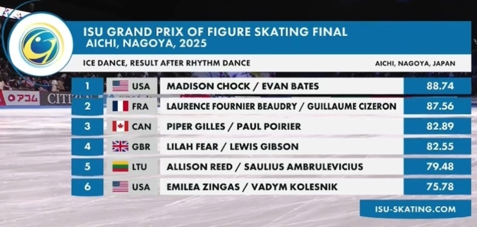 花滑总决赛韵律舞战罢:美国夫妻档险胜!法国组合1分之差紧随其后