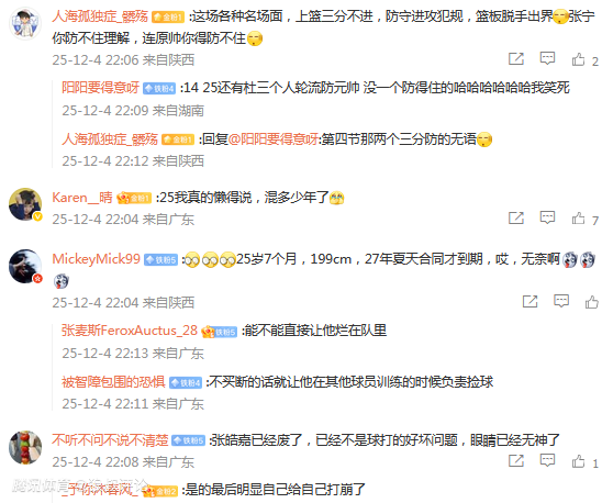 有球迷调侃说道:“这场各种名场面,上篮三分不进,防守进攻犯规,篮板脱手出界张宁你防不住理解,连原帅你得防不住”。