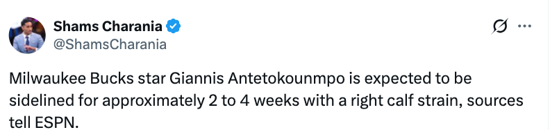2025-12-05 01:10北京时间12月5日,据名记Shams报道,密尔沃基雄鹿球星字母哥因右小腿拉伤,预计将缺席约2至4周的比赛。