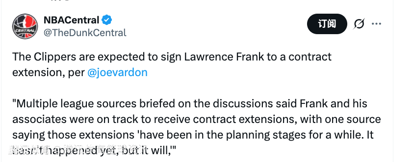 Vardon表示:“多位了解谈判情况的联盟消息人士透露,弗兰克及其团队已进入续约流程,其中一位消息人士表示‘续约事宜已筹备一段时间,目前尚未完成,但很快就会敲定。’”