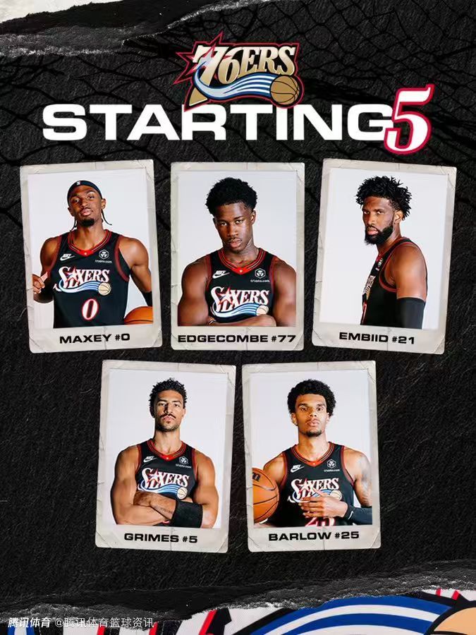 76人首发阵容为:马克西、恩比德、埃奇库姆、格雷姆斯、巴洛