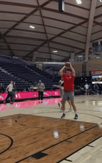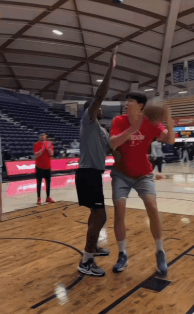 赛前,杨瀚森和球队训练师一起进行了热身训练,在篮下练习着一些勾手、突破上篮、罚球、三分球投射,随后他也在场边和教练组的成员看起了比赛录像。