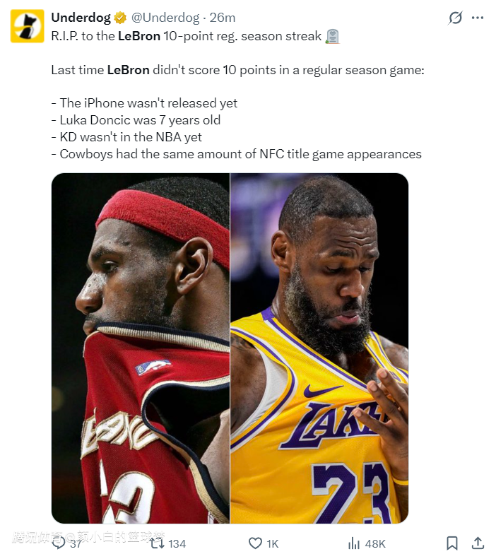 美媒用回忆证明勒布朗的伟大:上一次老詹不上双,推特才成立不到1年,布朗尼才2岁,弗拉格才15天。