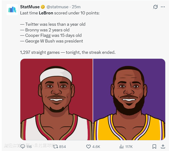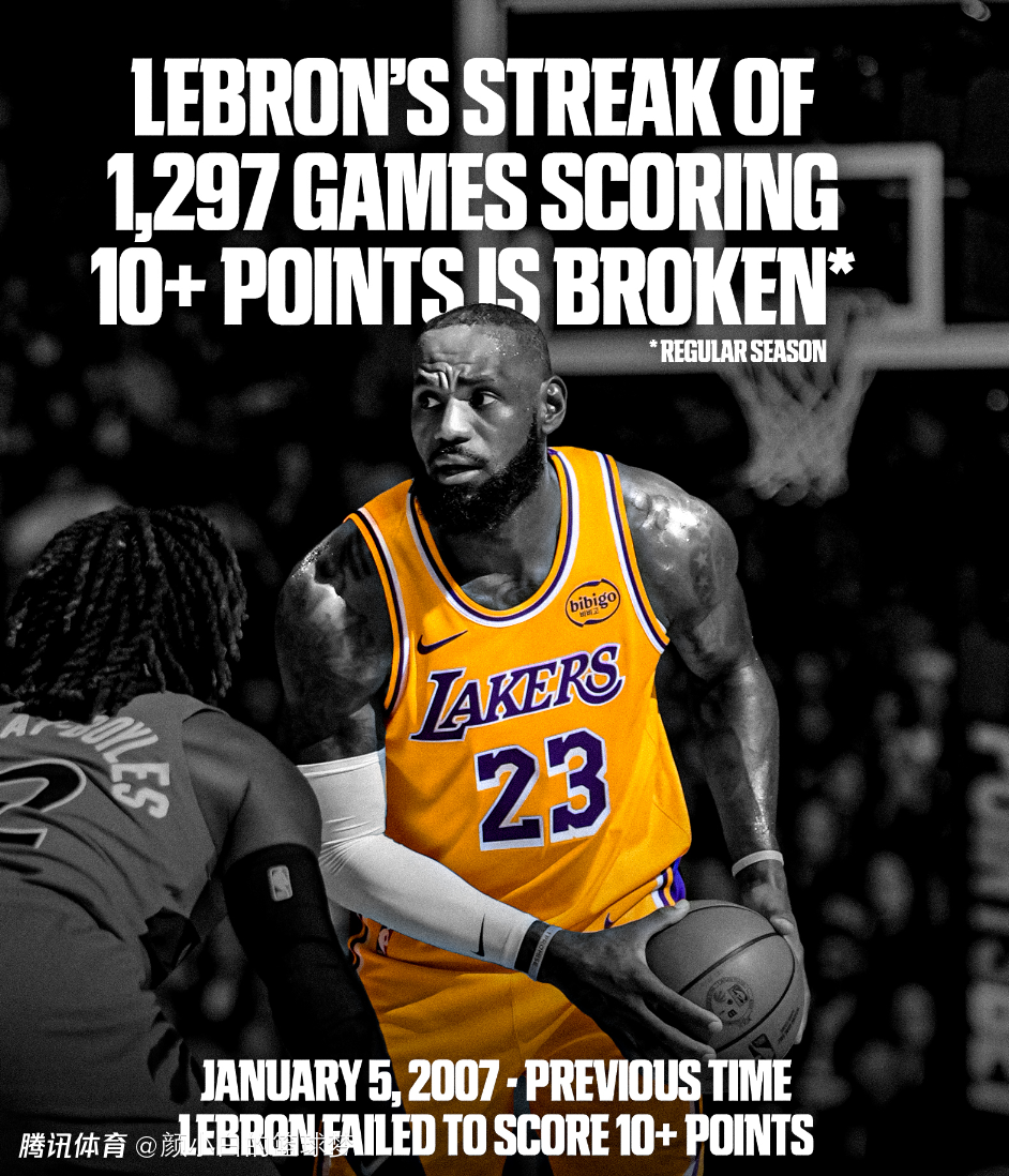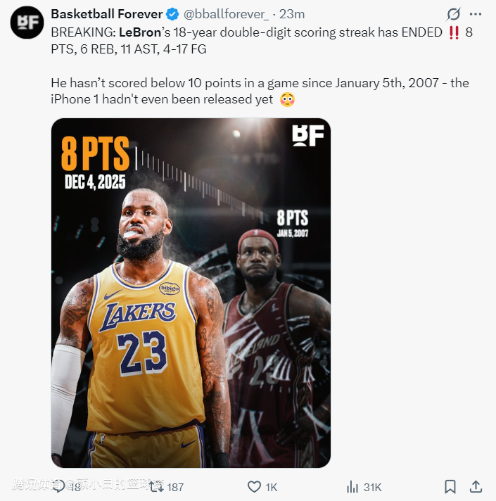 2025-12-05 11:50这个月底就将年满41岁的勒布朗-詹姆斯,又迎来了一个别样的夜晚,他终结了1297场连续上双纪录,他17投仅4中拿到8分而已,自2007年1月5日-2025年12月5日,这6909天历史第一的神迹就这样中断了,遗憾吗?肯定遗憾吗?但不值得吗?当然值得,因为他换来了绝杀传球。
