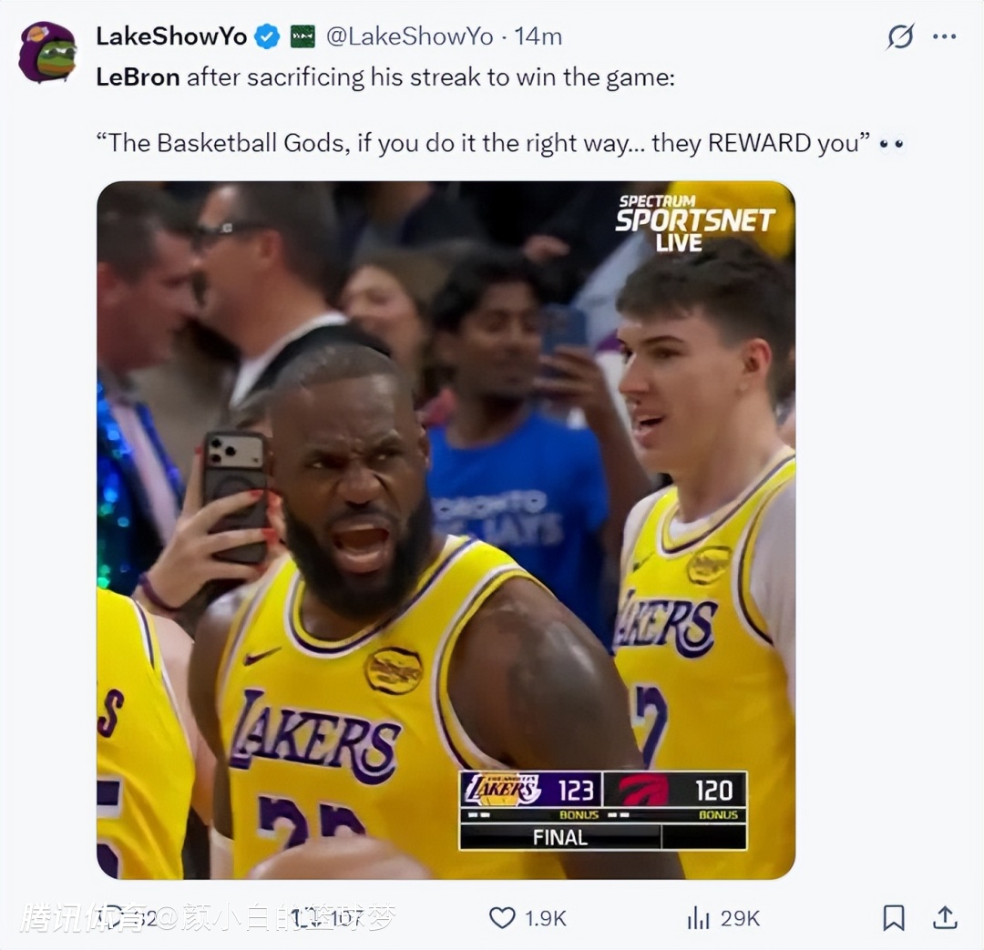 湖媒:勒布朗为了赢得比赛放弃了自己的连续上双纪录,篮球之神只要你做的恰到好处他就会奖赏你。