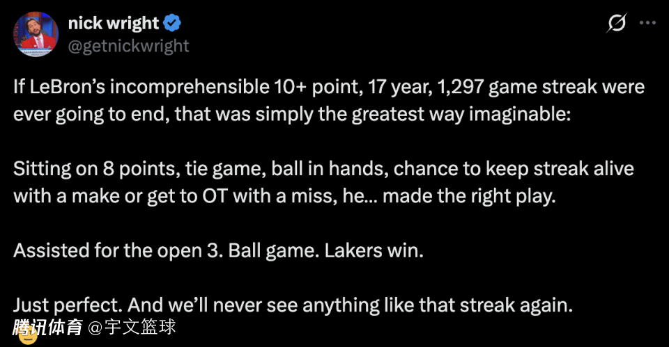 “如果勒布朗那令人难以置信的连续17年、1297场比赛得分超过10分的纪录注定要结束,那么这无疑是最完美的结局: 当时他得了8分,比分打平,球在他手中,有机会投进一球延续连胜,或者投丢一球进入加时赛,他做出了正确的选择,助攻队友空位三分,比赛结束,湖人获胜。这简直完美,我们以后再也看不到这样的连胜纪录了。”
