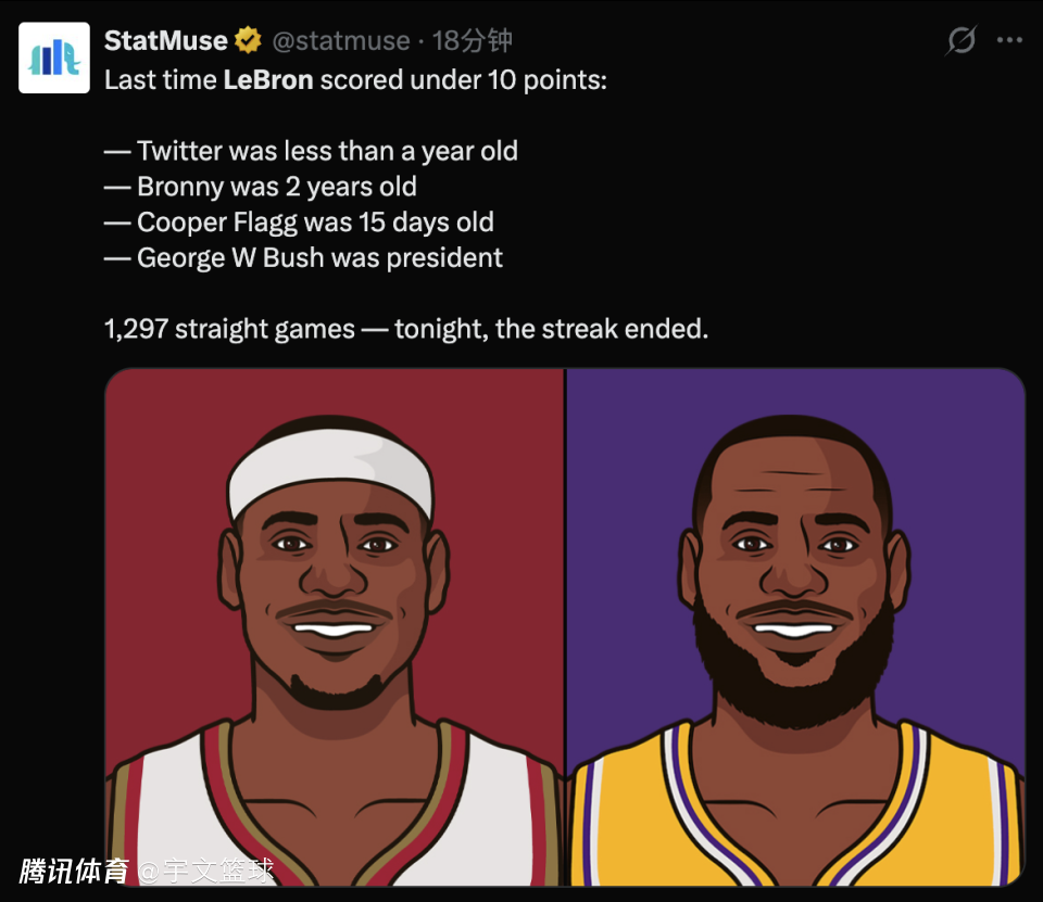 数据统计媒体StatMuse:Last time LeBron scored under 10 points: — Twitter was less than a year old — Bronny was 2 years old — Cooper Flagg was 15 days old — George W Bush was president 1,297 straight games — tonight, the streak ended.