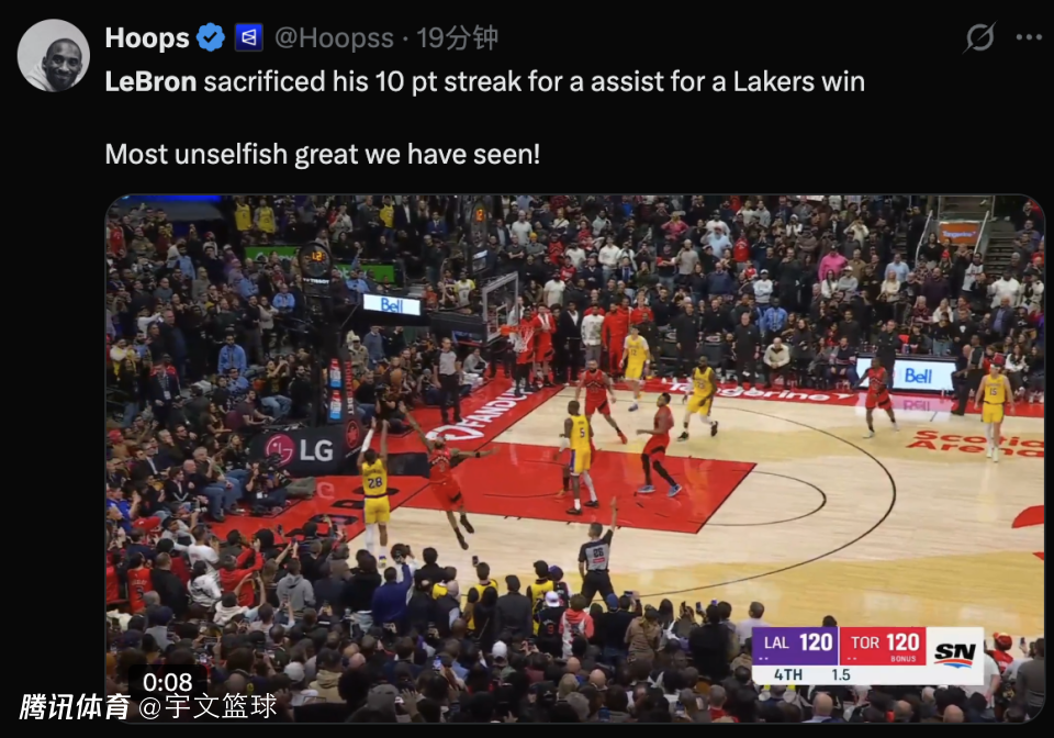 美媒Hoops:“LeBron sacrificed his 10 pt streak for an assist for a Lakers win Most unselfish great we have seen!”