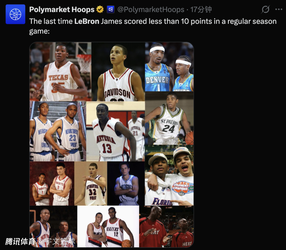 美媒Polymarket Hoops晒出上一次詹姆斯不上双时的年代图,当时杜兰特、库里、哈登、欧文、格里芬都还在上大学,姚明搭档仍是麦迪,JR和艾弗森在丹佛联手,霍福德和诺阿帮助佛罗里达大学拿到冠军,奥尼尔都还在热火,主教练雷迪克还是魔术新秀。