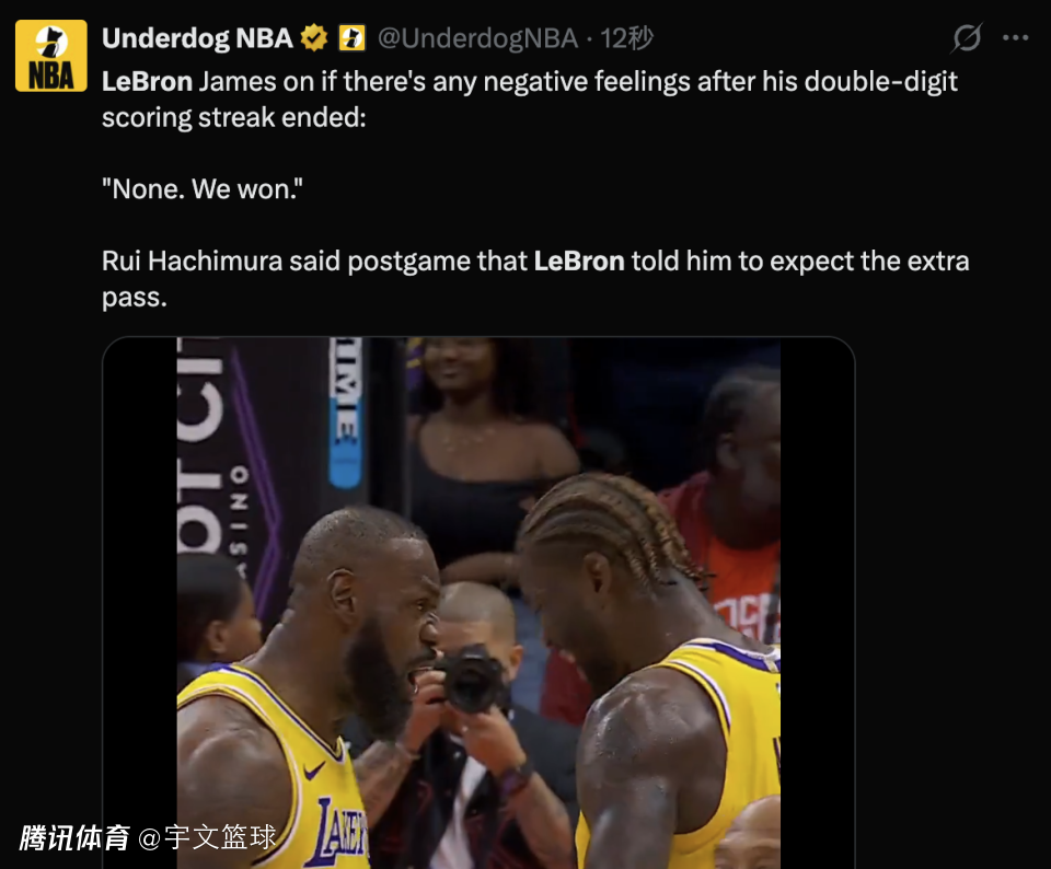 美媒UnderDog:LeBron James on if there's any negative feelings after his double-digit scoring streak ended: "None. We won." Rui Hachimura said postgame that LeBron told him to expect the extra pass.