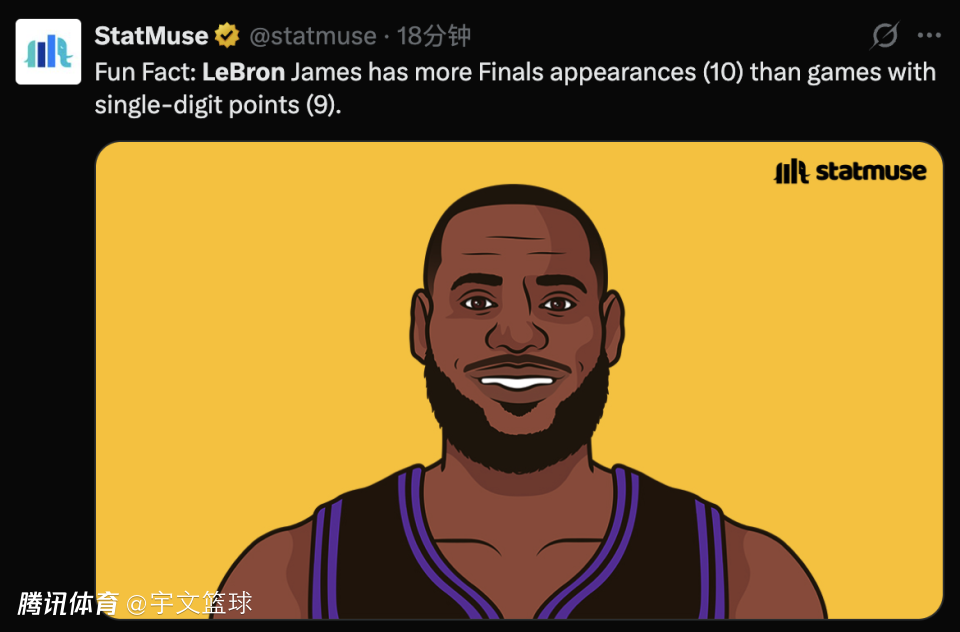 StatMuse再度发文:Fun Fact: LeBron James has more Finals appearances (10) than games with single-digit points (9).
