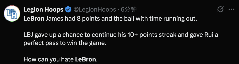 美媒Legion Hoops:LeBron James had 8 points and the ball with time running out. LBJ gave up a chance to continue his 10+ points streak and gave Rui a perfect pass to win the game. How can you hate LeBron.