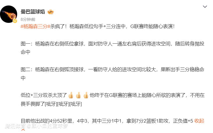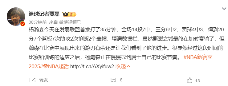 2025-12-05 14:00杨瀚森在G联赛又打出一场完美的球,全场比赛20+7+7,他直接登上了国内的热搜榜,作为现役中国男篮唯一一个在NBA打球的球员,中国球迷们都很关注他的表现。