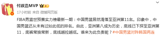 媒体人付政浩发文点评:“FIBA男篮世预赛实力榜最新一期:中国男篮居然滑落至亚洲第11名。印象中,中国男篮还从未有过如此低的排名。自此,亚洲第八成为历史,底线已下探至亚洲第11,底裤常换常新,底线越拉越低。谁来为此负责呢?”。