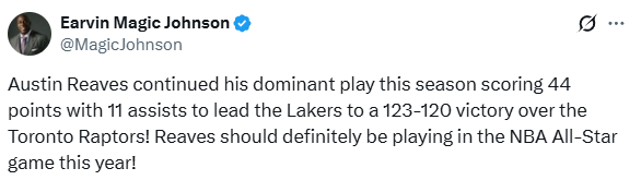 湖人名宿魔术师约翰逊则评论道:里夫斯继续他在本赛季的统治级表现,砍下44分并送出11次助攻,带领湖人以123-120战胜多伦多猛龙!里夫斯本赛季绝对入选参加NBA全明星赛!