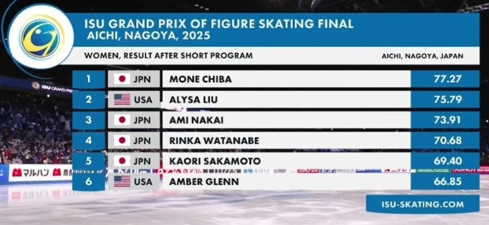 2025-12-05 21:2025/26花滑总决赛在日本-名古屋结束成年组女单短节目的比拼:东道主名将千叶百音以77.27分技压群芳;美国名将艾丽莎以75.79紧随其后,17岁新秀中井亚美以73.91排在第三位。