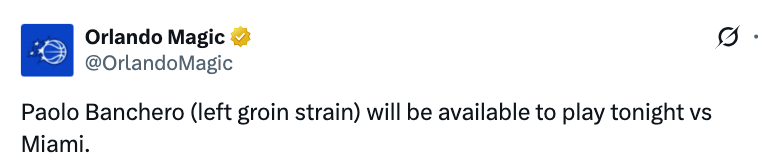 2025-12-06 00:40北京时间12月6日,奥兰多魔术队宣布,班凯罗将在今天主场对阵迈阿密热火的比赛中复出,此前他因左腹股沟拉伤缺席了过去10场比赛。