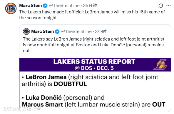 2025-12-06 07:00北京时间12月6日,NBA常规赛继续进行,湖人客场背靠背大战凯尔特人,东契奇因个人原因继续休战,詹姆斯则是因伤病管理轮休不打,这意味着詹姆斯获得评奖资格的希望更小了。
