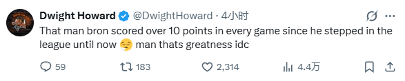 詹姆斯连续1297场得分上双纪录终结引全美热议,前NBA球员霍华德今日发推写道:那家伙自从进入联盟以来,每场比赛的得分都上双,这太伟大了,我不在乎别人说什么。