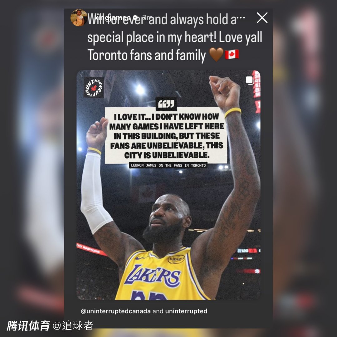 今日,詹姆斯转发了自己在昨日对阵猛龙赛后感谢多伦多球迷的言论:“我喜欢这些。我不知道自己在这座球馆内还剩多少场比赛,但这些球迷和这座城市都是难以置信的。”然后配文写道:将永远在我的心中占据特殊的位置!多伦多的球迷和家庭们,我爱你们。