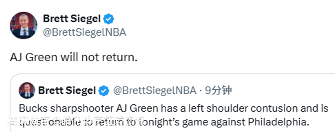 2025-12-06 10:40北京时间12月6日,NBA常规赛,雄鹿主场对阵76人,雄鹿球员AJ-格林遭遇左肩挫伤,本场比赛不会回归。