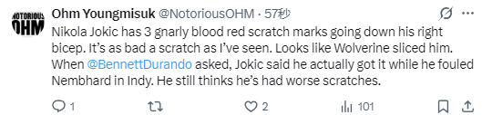 约基奇称赞了队友穆雷,表示他为球队最终取胜立下大功,而在谈到自己胳膊上的伤痕时,约基奇透露这道伤痕其实是在印第安纳对阵内姆布哈德时,自己被犯规时留下的,而且约基奇还认为自己以前受过更严重的抓伤。