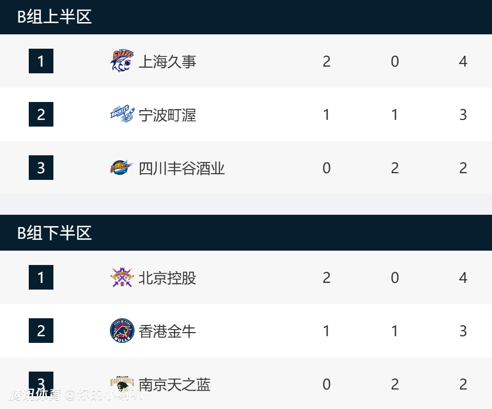 浙江方兴渡、青岛崂山啤酒暂居A组前两名;上海久事以2胜0负暂居B组上半区第一名,北京控股以2胜0负暂居B组下半区第一名;浙江稠州金租以1胜0负暂居C组上半区第一名,长白山恩都里以2胜0负暂居C组下半区第一名;山西汾酒以2胜0负暂居D组上半区第一名,合肥狂风以1胜1负暂居D组下半区第一名。