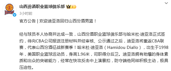 2025-12-06 17:20北京时间12月6日,根据山西男篮官方社媒公示,经与球员本人协商并达成一致,山西汾酒职业篮球俱乐部与哈米杜·迪亚洛正式签约,待向CBA公司报送注册材料并经审核、公示通过之后,迪亚洛将重返CBA联赛,代表山西汾酒征战新赛季。