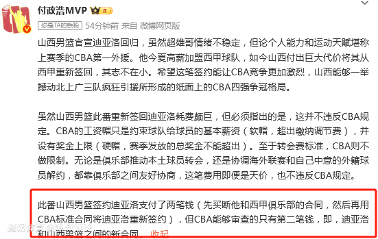 媒体人:山西重签迪亚洛支付了两笔钱 但CBA能够审查的仅是第二笔钱
