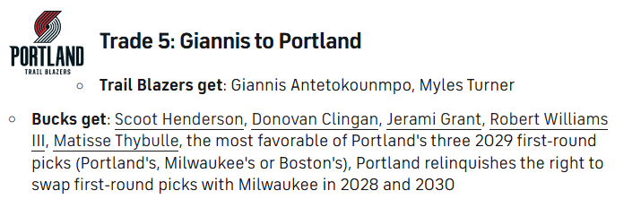 这笔6换2的具体方案是开拓者得到字母哥和特纳,送出亨德森、克林根、格兰特、罗威、塞布尔、开拓者所持三个2029年首轮签中顺位最优的签位(开拓者、雄鹿和凯尔特人),同时开拓者放弃2028年和2030年与雄鹿的首轮签互换权。