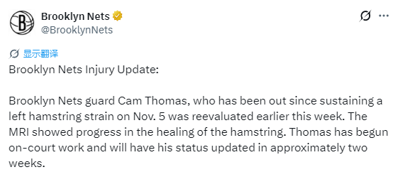 篮网伤病更新:托马斯恢复进展顺利 已开启场内训练两周后再评估出战状态