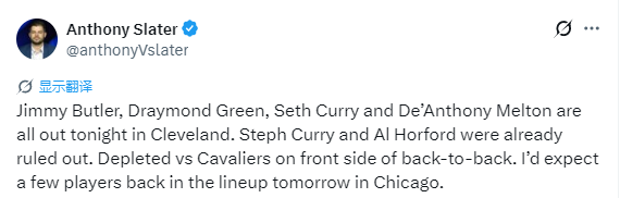 2025-12-07 06:10北京时间12月7日,NBA常规赛继续进行,勇士对阵骑士。赛前,勇士队记Anthony Slater报道球队本场比赛最新伤情状况。