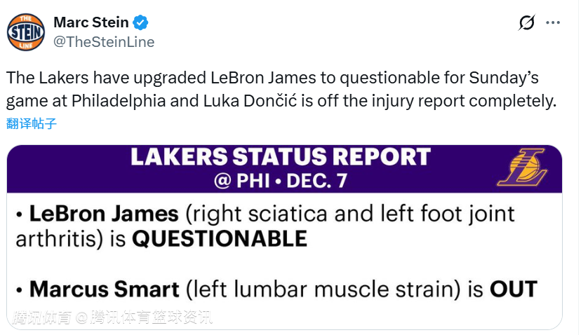与此同时,湖人已将詹姆斯的出战状态升级为出战成疑,斯马特因左侧腰肌拉伤将确定缺阵本场比赛。