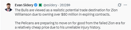 2025-12-07 09:20北京时间12月7日,根据NBA记者Evan Sidery报道,公牛队可能成为鹈鹕队球员锡安的潜在下家。