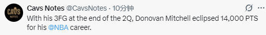 根据数据统计显示,本场比赛之前,米切尔职业生涯总计得到13993分,凭借上半场的8分,他的生涯总得分突破14000分大关。