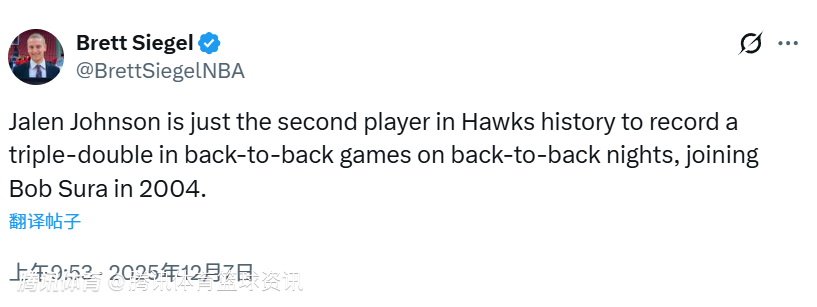 2025-12-07 10:10北京时间12月7日,NBA常规赛继续进行,老鹰队对阵奇才队。三节比赛打完,老鹰球员杰伦-约翰逊已经砍下18分10篮板10助攻,连续两场比赛砍下三双,他也迎来了职业生涯的新里程碑。