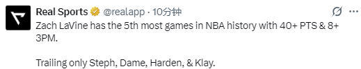此外,拉文目前单场得分40+且命中8+三分球的场次数排在NBA历史第5位,仅次于斯蒂芬-库里、利拉德、哈登和克莱-汤普森。