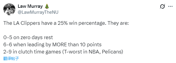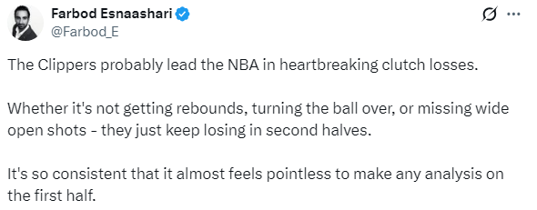 快船惨遭18分逆转,快船随队记者Farbod Esnaashari连续批评球队:“快船队在关键时刻惨痛失利数可能是联盟第一。无论是篮板球争抢不力、失误过多,还是错失空位投篮机会,他们在下半场总是不断输球。这种情况如此频繁,以至于分析上半场的表现似乎变得毫无意义。”