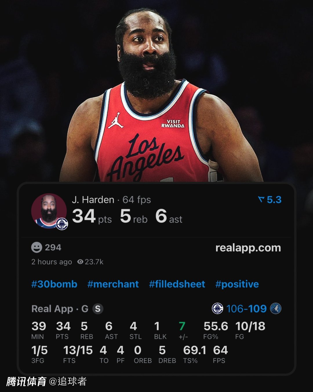 本场比赛,哈登出战38分57秒,18中10,其中三分5中1,罚球15中13,得到34分5篮板6助攻4抢断1盖帽4失误,正负值+7,可惜总得分超越安东尼之夜惨遭大逆转。