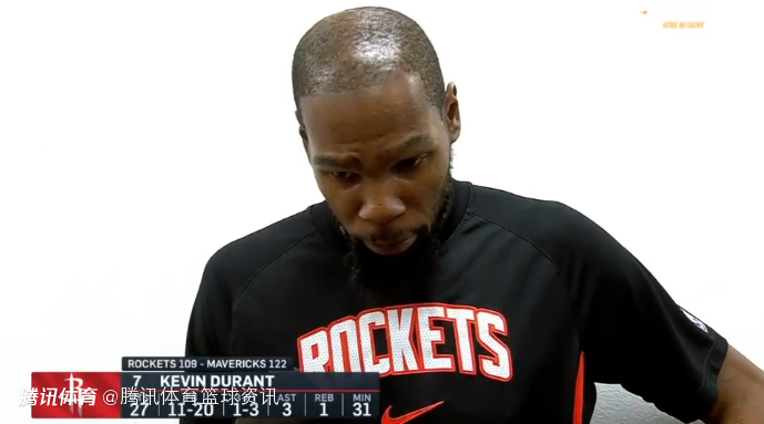 2025-12-07 12:50北京时间12月7日,NBA常规赛继续进行,火箭以109-122不敌独行侠。本场比赛,火箭球星杜兰特出战31分钟,20投11中,其中三分球3投1中,罚球4投4中,得到27分1篮板3助攻。赛后,他接受媒体采访。