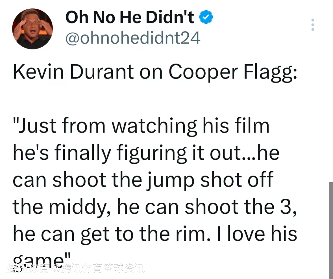 杜兰特:弗拉格终于找到比赛节奏 我很欣赏他的打法