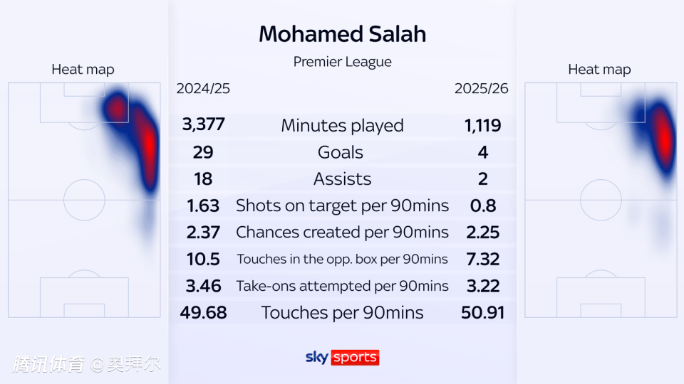 从数据来看,萨拉赫本赛季状态明显下滑,场均射门从1.63次下降到0.8次,场均创造机会、对手禁区内触球、突破次数分别从2.37次、10.5次、3.36次下降到2.25次、7.32次以及3.22次。