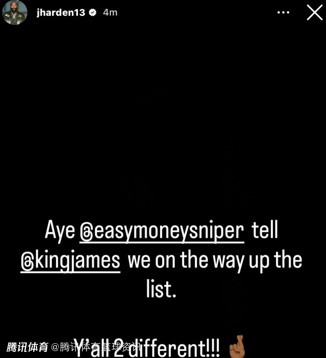 哈登在社媒写道:“嘿,杜兰特,告诉詹姆斯(艾特了两人的社媒账号),我们正在榜单上往上冲呢,你们俩可都是独一档的存在!”