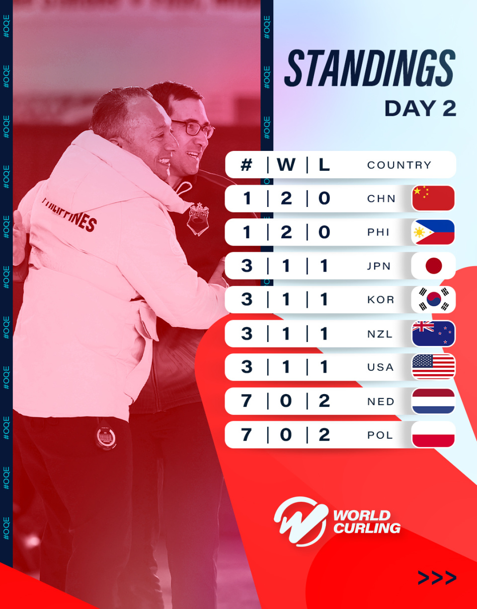 第二轮结束后,就只有中国和菲律宾两场都是胜利,并列排在前两位。日本、韩国、新西兰和美国1胜1负并列第三。