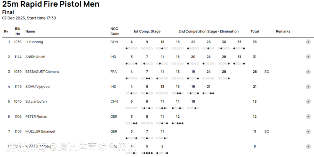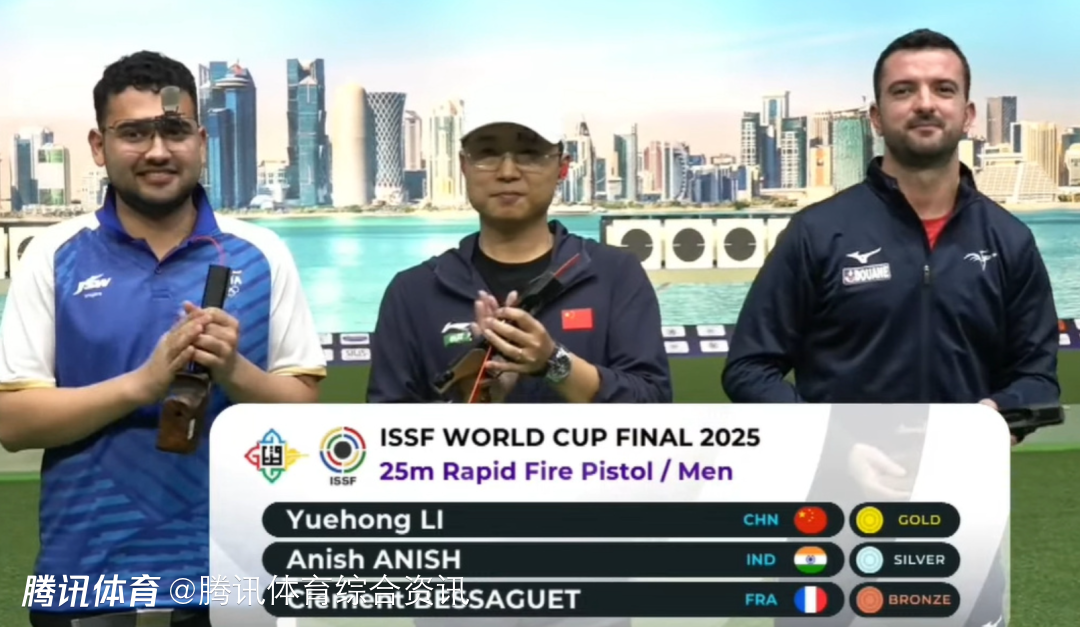 2025-12-07 23:40北京时间12月7日,在多哈进行的射击世界杯总决赛结束了男子25米手枪速射比赛。奥运冠军李越宏从第二轮开始一直领先,以33中夺得中国队第三枚金牌。印度阿尼什和法国世锦赛冠军贝萨盖分获银铜牌。另外一位中国选手苏连博凡名列第五。