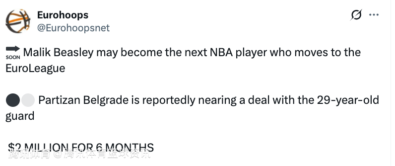 转战欧洲!贝尔格莱德游击队即将和马利克-比斯利达成协议 薪水为6个月200万