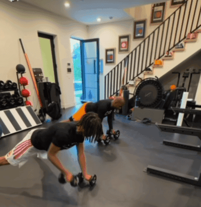两人一同进行力量训练,之后保罗为儿子送上助攻,给CP4传了一个打板空接暴扣。CP4在完成暴扣后,也和父亲一起拍手庆祝,值得一提的是,CP4身上穿着的是马刺的训练服。