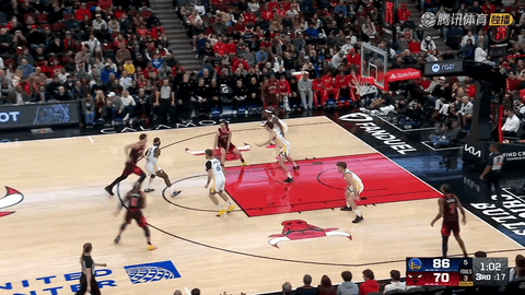 之后穆迪三分、波杰姆斯基三分和急停跳投接连入网,分差一度被拉到86:62。第三节还剩2分41秒时,公牛由科林斯上篮开启反扑,从86:62落后开始到还剩54秒,打出一波11:0的攻势,科林斯和吉迪轮番得分,将比分追到86:73,将分差缩小至13分;随后在还剩28秒时,卡特再中三分,把比分改写为86:76。