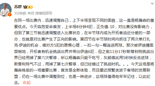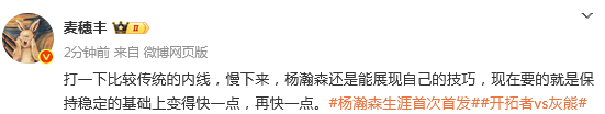 媒体人“麦穗丰”发文点评:打一下比较传统的内线,慢下来,杨瀚森还是能展现自己的技巧,现在要的就是保持稳定的基础上变得快一点,再快一点。