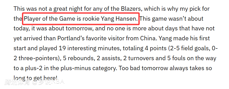 Blazer's Edge的解释是:“对开拓者全队而言,今晚的表现都难言出色,这也是我把本场最佳球员投给新秀杨瀚森的原因。这场比赛的意义本就不在于当下,而在于未来,而在波特兰,没人比这位来自中国的人气新星更能代表球队的未来。